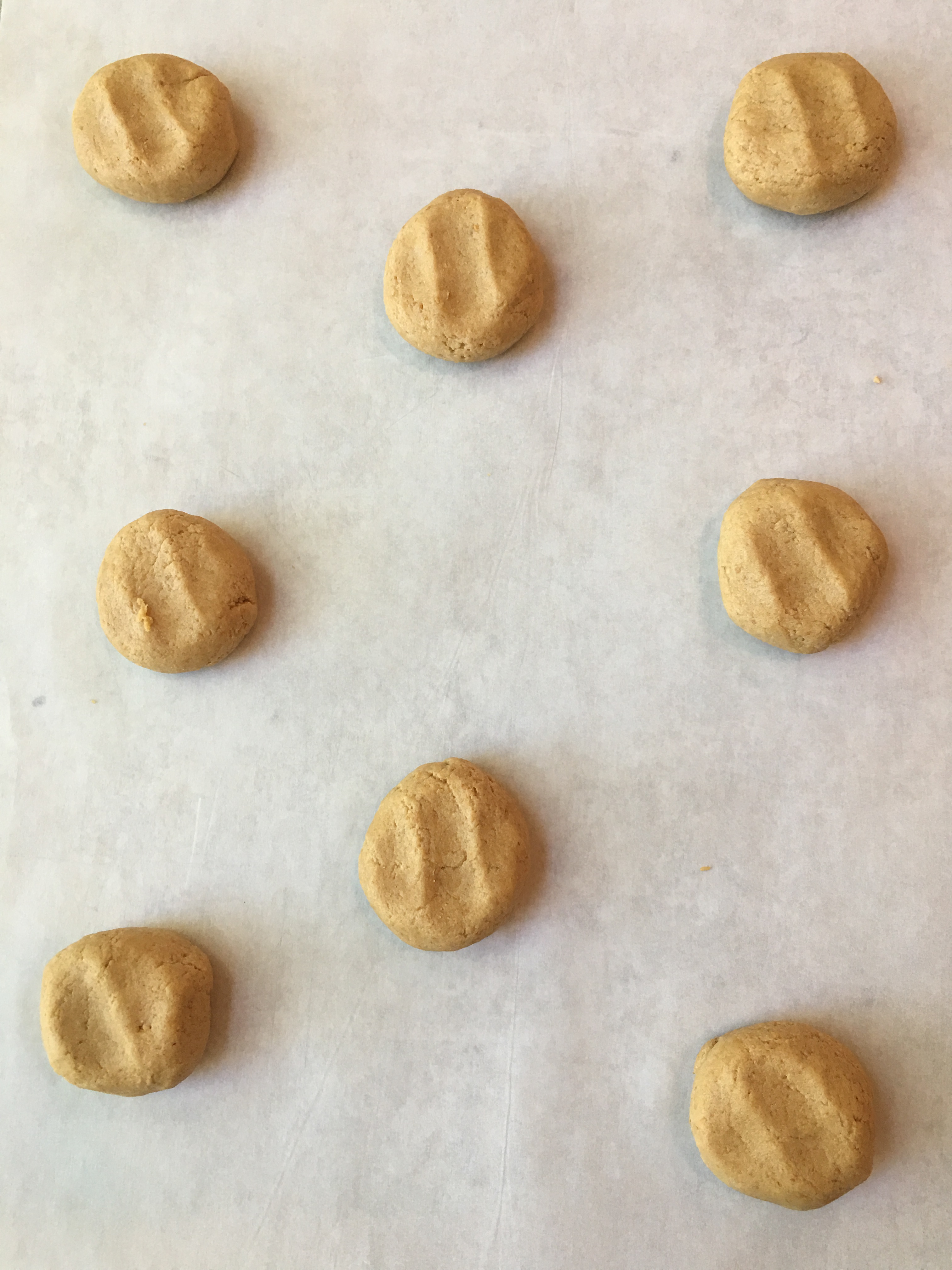 Scoop out approximately 16 1.5” balls of dough. Gently roll. For a richer flavor and smoother texture, form cookie dough balls, flatten slightly, and refrigerate or freeze until ready to bake. Place on greased or parchment paper on an aluminum cookie sheet. Bake at 375 degrees for 10 min.