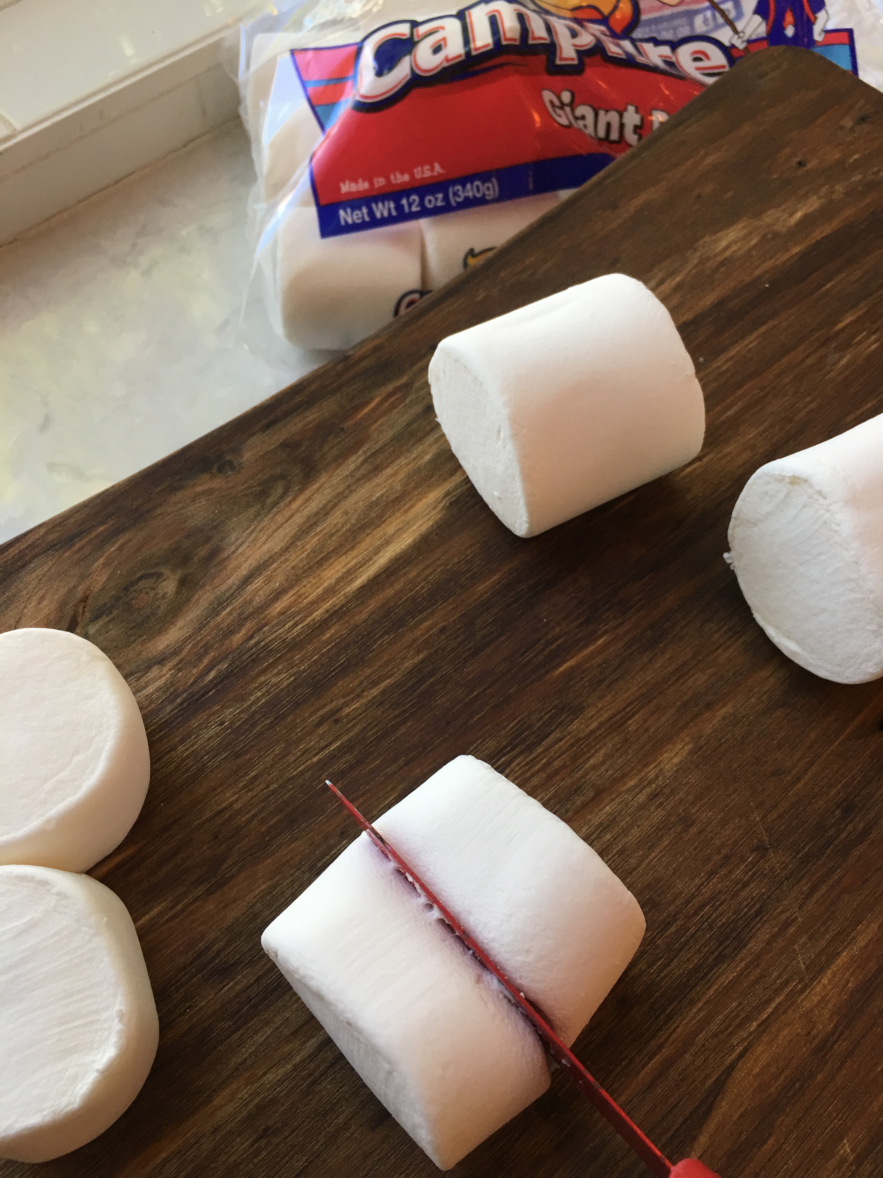 Slice 8 Campfire Giant Roaster size marshmallows in half. (If you can’t find Campfire’s Giant Roaster marshmallows, cut a large marshmallow in half, using both halves.)
