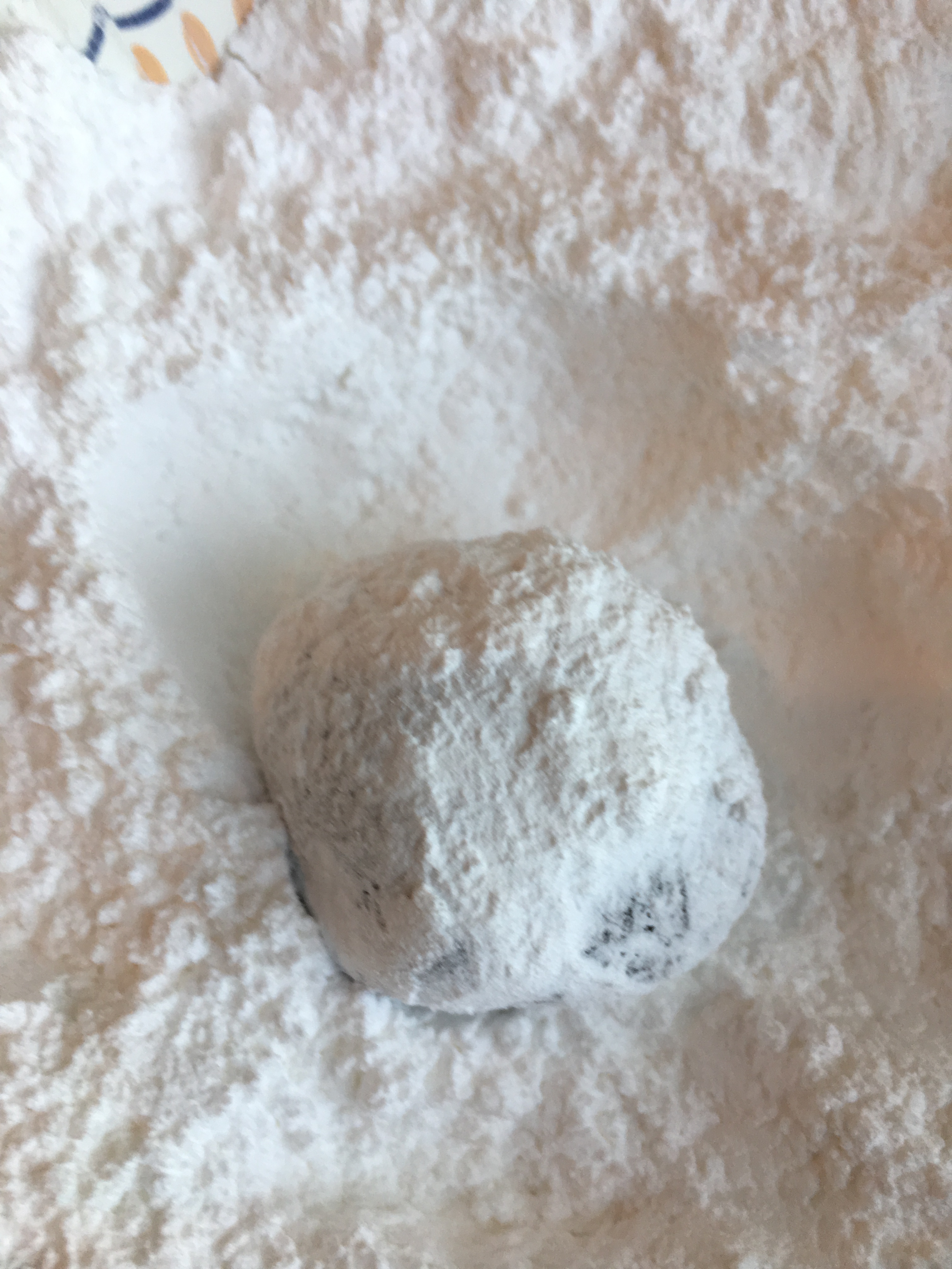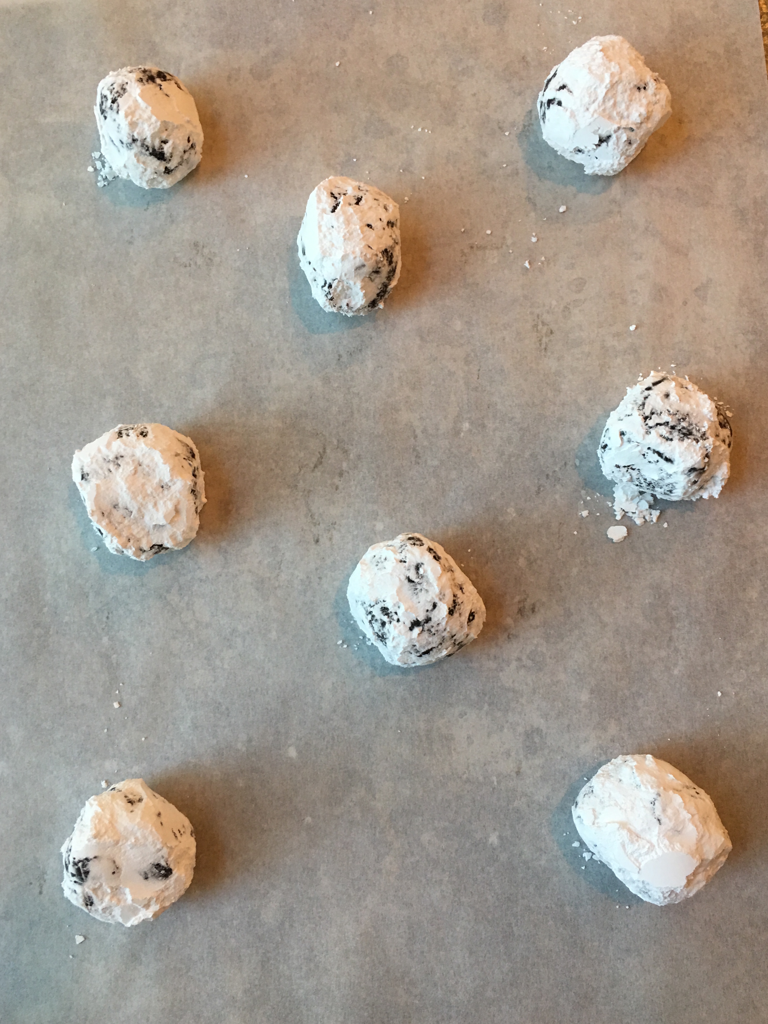Chill dough for three hours. Preheat oven to 375 degrees. Scoop out 24+ 1 ½ “ balls of dough, and roll into a ball with hands. Prior to baking, roll the ball of dough into powdered sugar.
