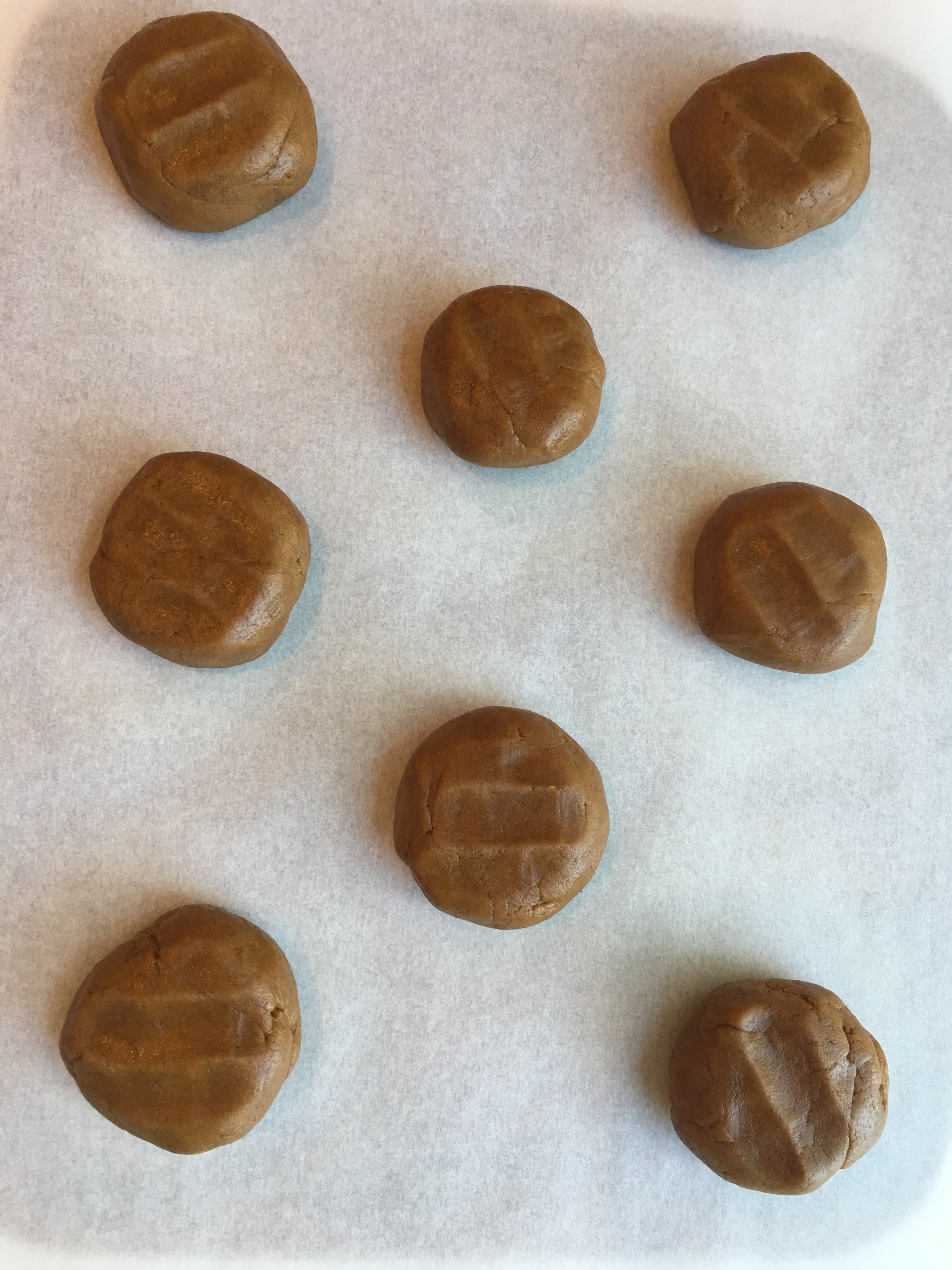 Scoop out approximately 20 + 2” balls of dough. Roll into balls. For a richer flavor and smoother texture, form cookie dough balls and refrigerate or freeze until ready to bake. Place on greased or parchment paper on an aluminum cookie sheet.