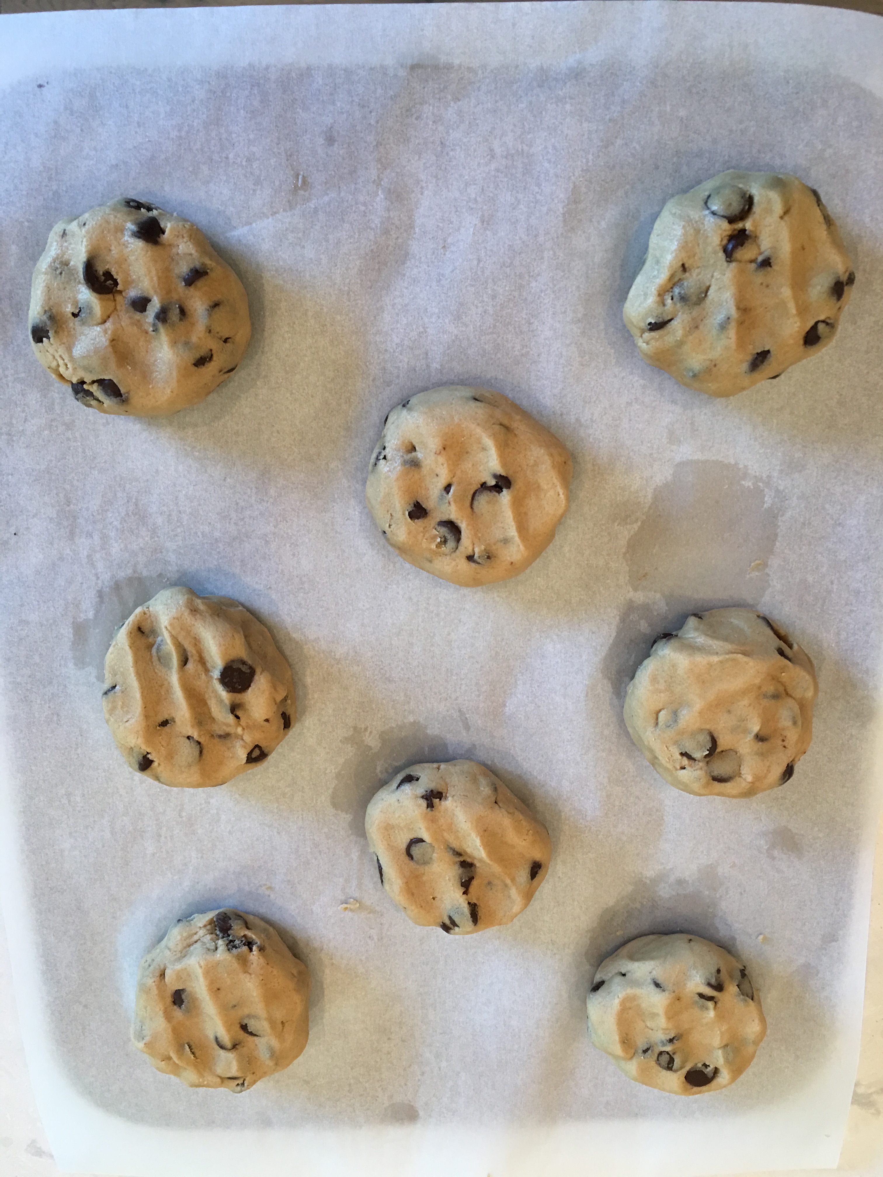 Stir in chocolate chips. Scoop out approximately 24 2” balls of dough. Gently roll. For a richer flavor and smoother texture, form cookie dough balls, flatten slightly and refrigerate or freeze until ready to bake. Place on greased or parchment paper on an aluminum cookie sheet.