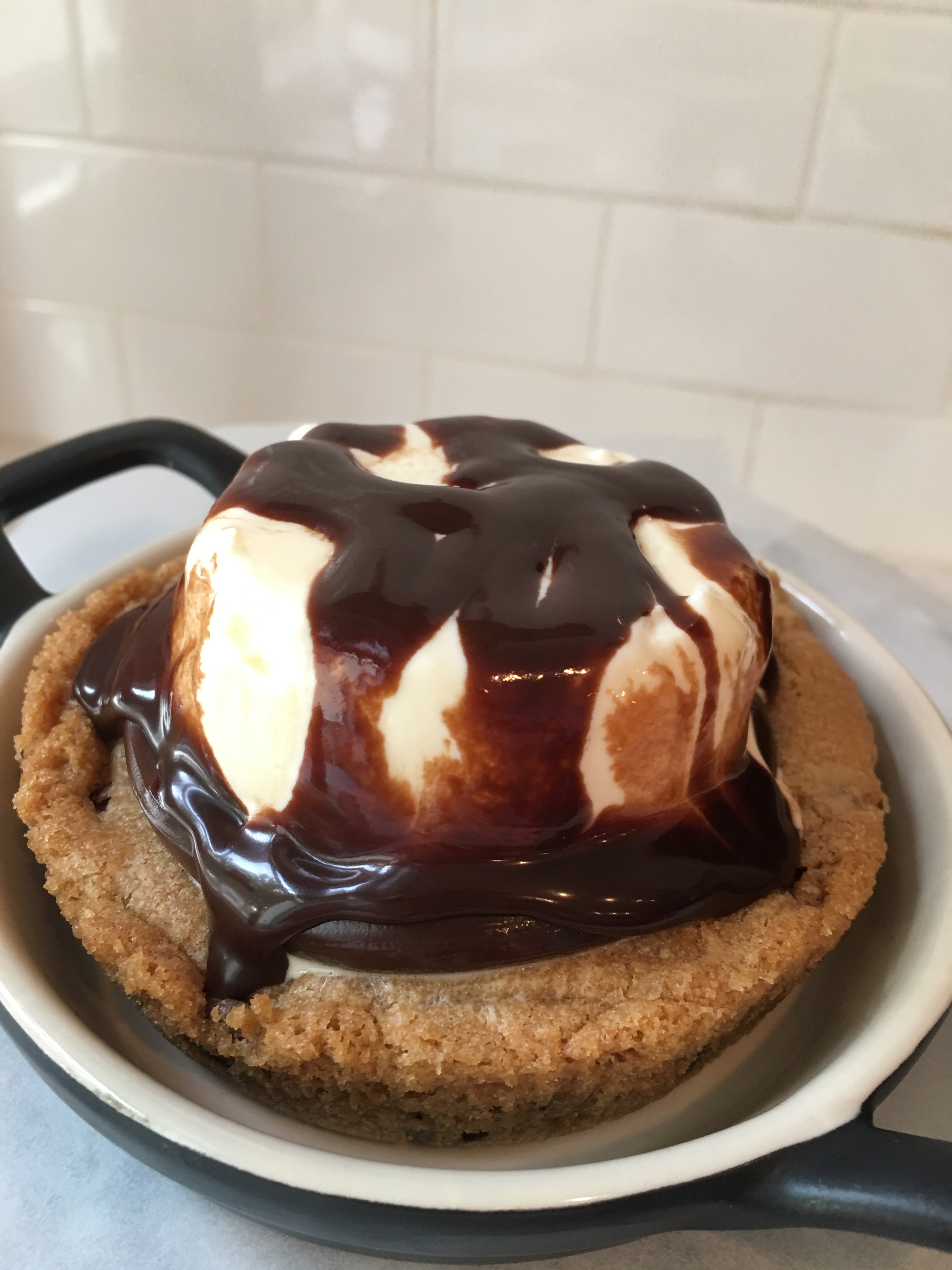 For the Pizookie, bake cookie dough in small pie tin at 375 degrees for 12-14 minutes. While hot, serve up a generous helping of ice cream, hot fudge sauce, other sundae toppings and whipped cream if desired.