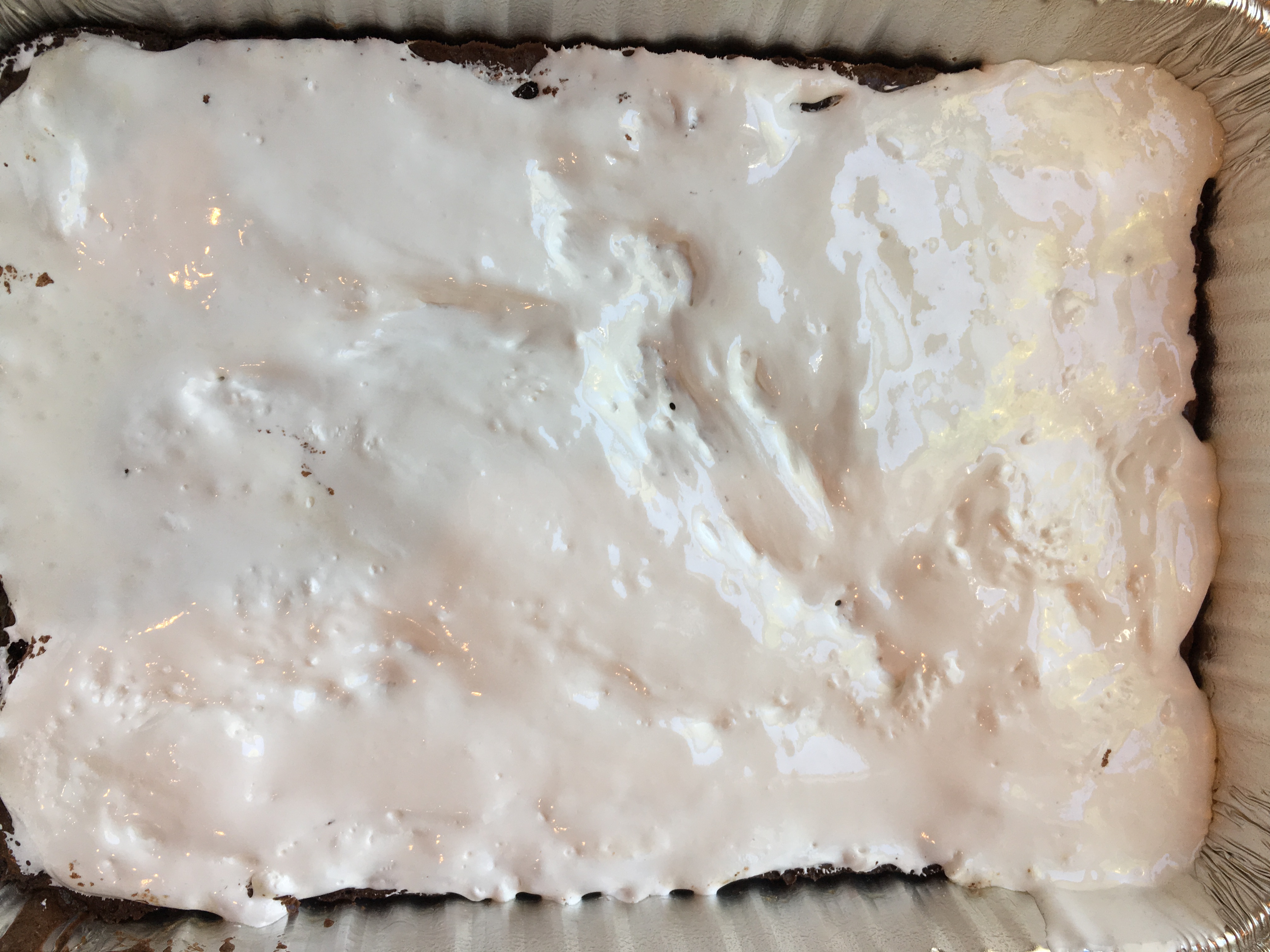 Spread 10 ounces of marshmallow fluff onto hot brownie. Spoon it on and let it sit for a minute. It is then easier to spread.