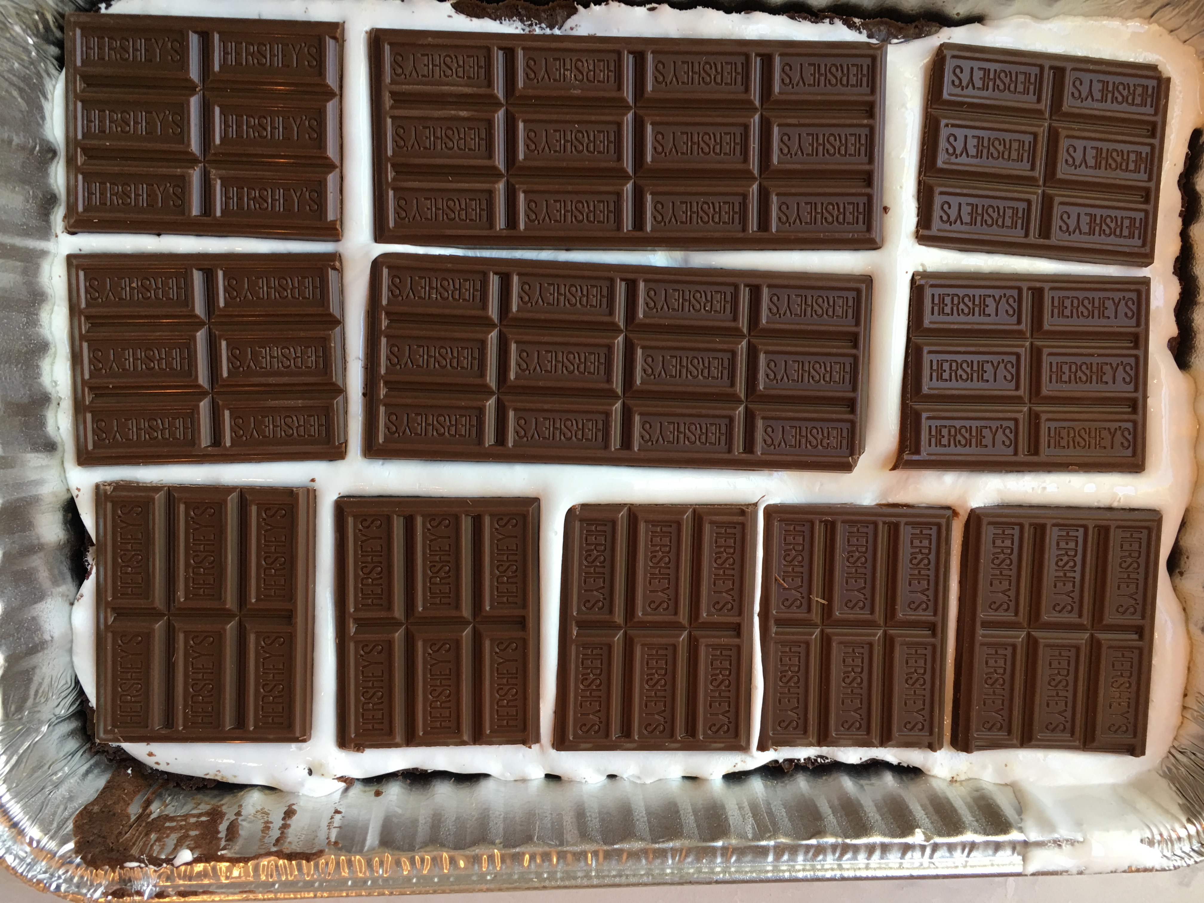 Place enough Hershey milk chocolate candy bars on top of marshmallow to cover it (I used 6 ½ 1.55 oz. bars).
