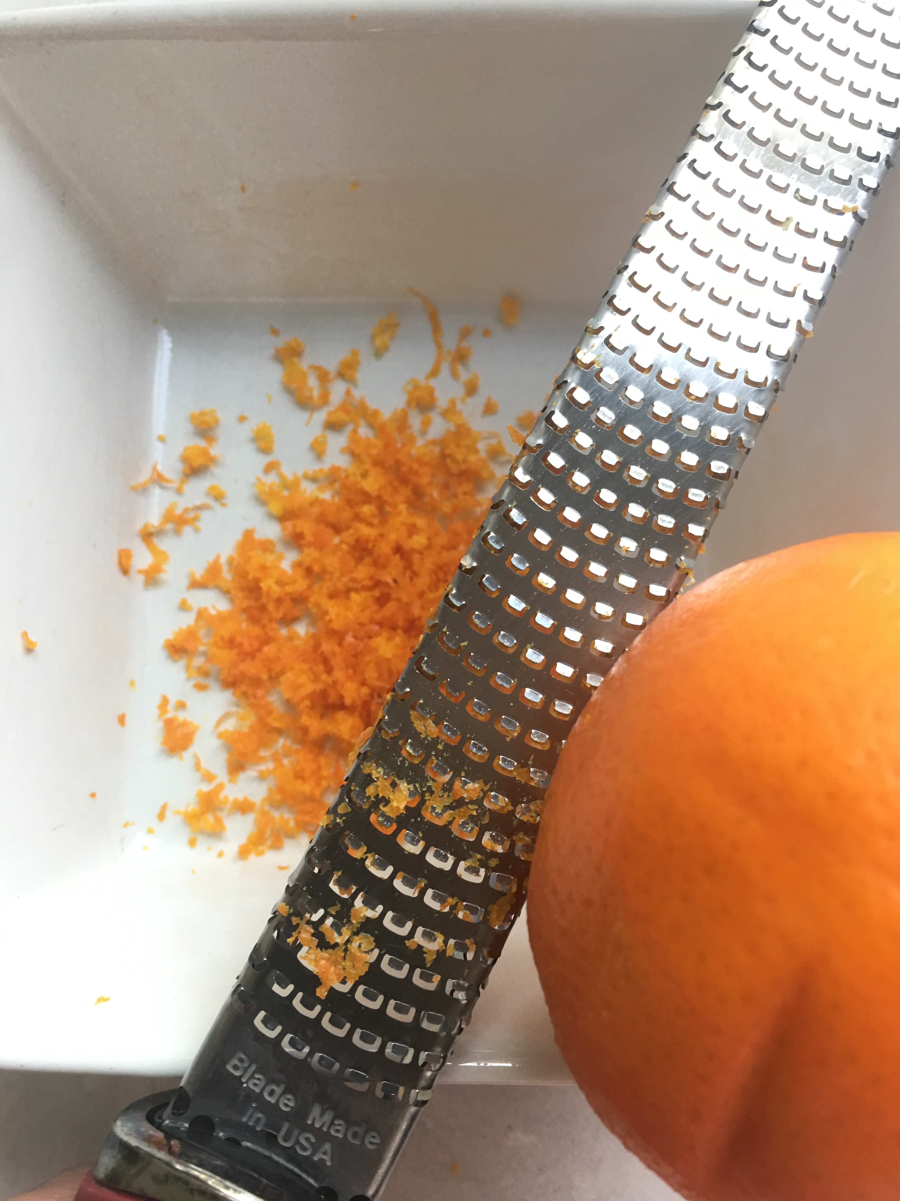 Hand stir in eggs, vanilla and orange zest; don’t overmix.
