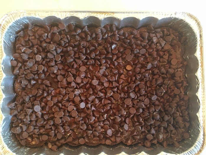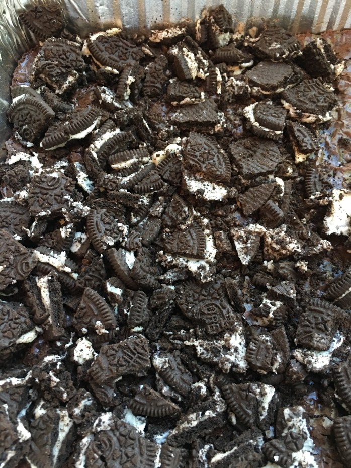 Spray a 9″ x 13″ pan with baking spray. Bake for 22-26 minutes or until done. Sprinkle brownie with 1 ½ cups semi-sweet chocolate chips or Oreos.