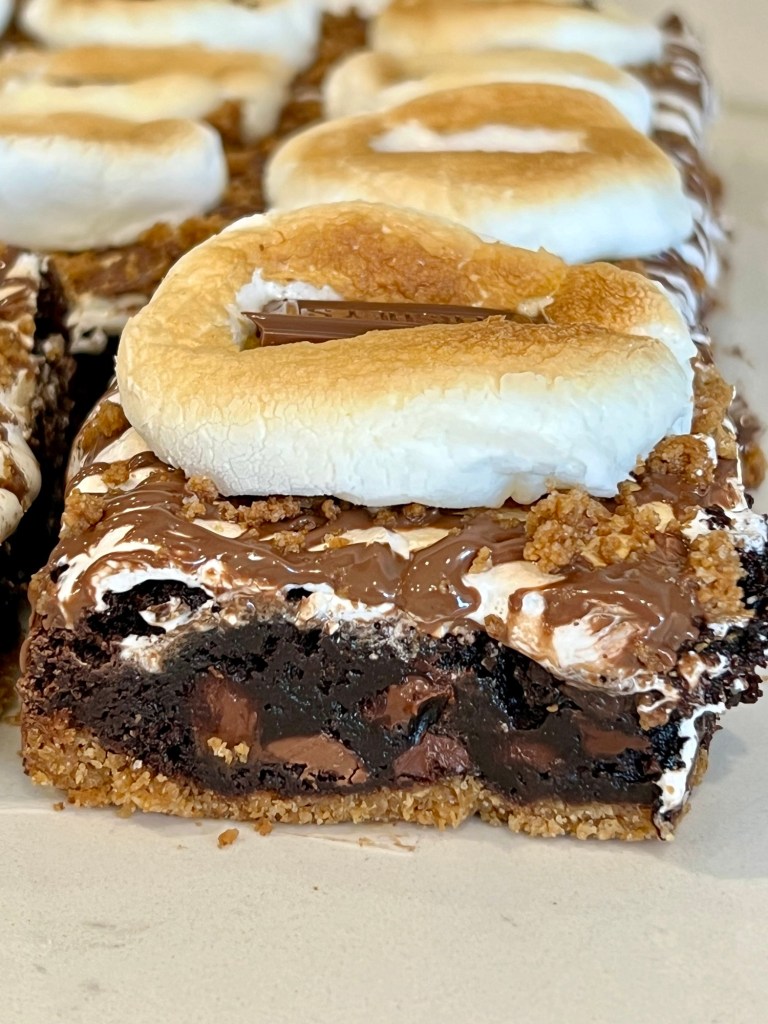 Remove from the oven and top with 7 oz. of marshmallow fluff. Broil in the oven until toasted. Drizzle 2 oz. of melted chocolate bar over the top. Immediately sprinkle with Graham Crumble. Garnish as desired with toasted marshmallows and chocolate pieces. I toasted marshmallows for the top by spraying a baking sheet with non-stick spray. I placed marshmallows onto the baking sheet and broiled them in the oven until desired toasted-ness. Place onto wet drizzled chocolate so that they “stick” to the top.